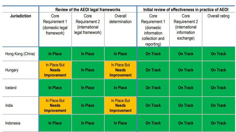 ในการตรวจสอบ Peer Review of the Automatic Exchange of Financial Account Information 2022 OECD พบว่าอินเดียจำเป็นต้องปรับปรุงกรอบการทำงานภายในประเทศเกี่ยวกับมาตรฐานการแลกเปลี่ยนข้อมูลอัตโนมัติ (Automatic Exchange of Information Standard)