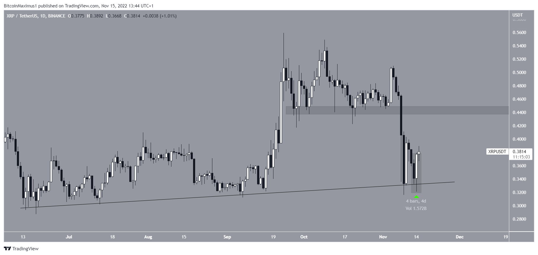 ในวันที่ 9 พฤศจิกายน XRP นั้น Breakdown (การที่กราฟมีราคาทะลุแนวรับที่ตั้งเอาไว้) ลงมาจากแนวรับแนวนอนที่ 0.44 ดอลลาร์ แล้วแตะระดับต่ำสุดที่ 0.31 ดอลลาร์ในวันถัดไป