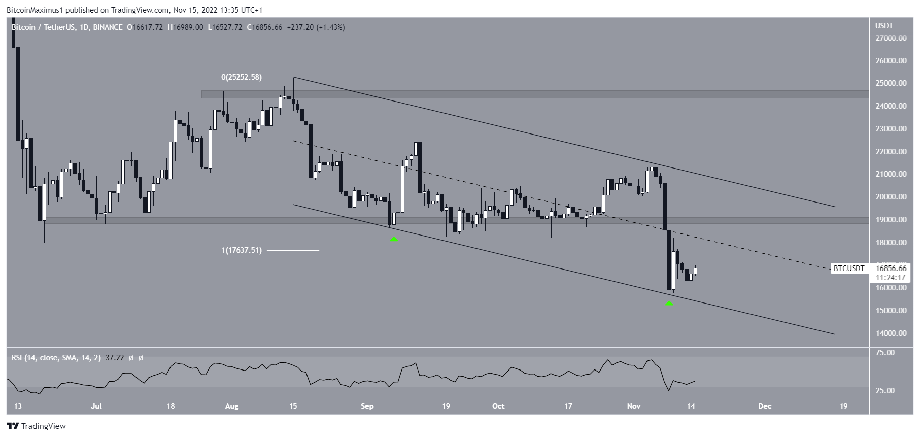 การวิเคราะห์ทางเทคนิคจากกรอบเวลารายวันแสดงให้เห็นว่าราคาของ Bitcoin กำลังซื้อขายอยู่ในช่องทางคู่ขนานจากมากไปน้อย (Descending Parallel Channel) มีการเด้งกลับที่แนวรับของช่องทาง 2 ครั้ง (ไอคอนสีเขียว) ล่าสุดเมื่อวันที่ 9 พฤศจิกายน