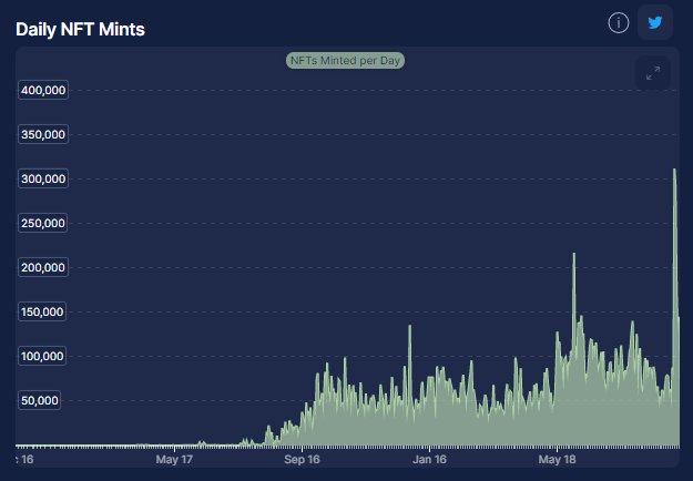 ข้อมูลจาก Hello Moon พบว่าจำนวนการมิ้นท์ ‘Solana NFTs’ รายวันพุ่งขึ้นทำจุดสูงสุดใหม่ทะลุ 3 แสนรายการ นอกจากนี้ ยังมีเงินลงทุนในโปรเจคต่างๆ มากขึ้นรวมถึง Y00ts โปรเจคที่สร้างกระแสเป็นอย่างมาก