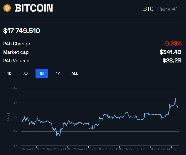 ราคาของ Bitcoin พุ่งขึ้นเป็น 18,300 ดอลลาร์สหรัฐเมื่อไม่กี่ชั่วโมงก่อน แต่ไม่สามารถรักษาระดับกำไรเหล่านั้นไว้ได้ โดยราคาตกลงไปที่ระดับวันพุธ เป็นผลให้สินทรัพย์มีการซื้อขายที่ 17,726 ดอลลาร์สหรัฐ ณ เวลาที่เขียนบทความต้นฉบับ