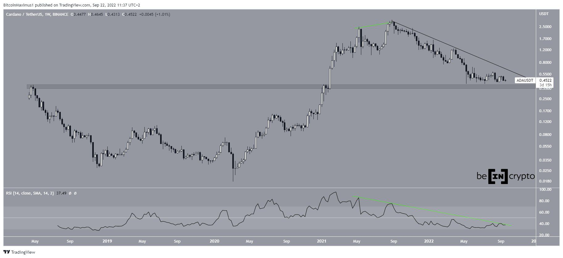 ราคาของ ADA ได้ลดลงต่ำกว่าเส้นแนวต้านจากมากไปน้อยตั้งแต่เดือนกันยายน 2021 เมื่อมันพึ่งจะมีราคาแตะระดับสูงสุดตลอดกาลที่ 3.10 ดอลลาร์ การลดลงดังกล่าวได้นำไปสู่ระดับต่ำสุดที่ 0.40 ดอลลาร์ในเดือนพฤษภาคม 2022