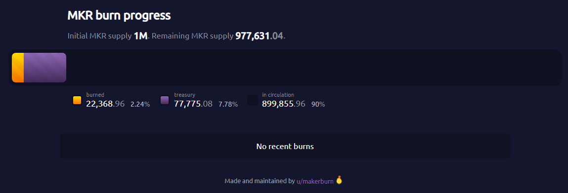 ในระบบ Tokenomics ของ MakerDao ผลิตภัณฑ์หลักของโปรเจค คือ การนำเหรียญคริปโตมาวางค้ำประกัน เพื่อกู้เหรียญ Stablecoin DAI หรือเรียกว่าการ Over-collateralized แต่หลังจากวิกฤตการหลุด peg ในเดือนมิถุนายน 2020 ได้มีการเปิดระบบกองทุนสำรอง (Surplus Buffer) ขึ้น โดยนำส่วนหนึ่งของค่าธรรมเนียมและดอกเบี้ยต่างๆ มาเก็บสะสมเข้ากองทุน หลังจากนั้น ระบบ MKRBurn ในปัจจุบันคือ การนำ DAI ส่วนเกินจากกองทุนสำรองมาซื้อคืน (buy back) เหรียญ MKR ในตลาดและส่งเข้าเตาเผา ระบบการเผานี้ในแง่หนึ่งคือ การลดอุปทานส่วนเกินในขณะเดียวกันก็เพื่อตอบแทนชุมชนทางอ้อมในเชิงของราคา ปัจจุบันมีการเผาไปแล้วกว่า 22,368 MKR นับเป็น 2.24% ของอุปทานทั้งหมด 1 ล้าน MKR