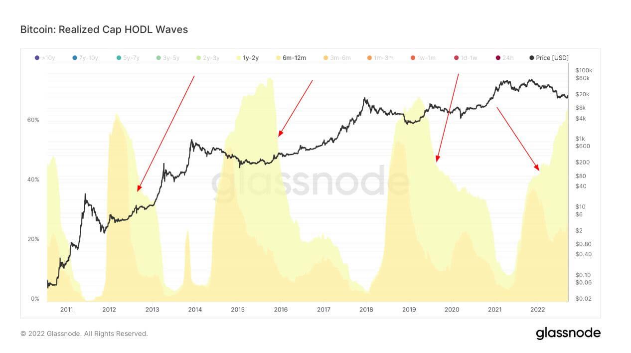 อ้างอิงข้อมูล Bitcoin Realized Cap HODL wave จาก Glassnode พบว่า กลุ่มนักลงทุนระยะสั้น 6-12 เดือน แสดงรูปแบบพฤติกรรมที่ไม่แตกต่างไปจากวัฏจักรก่อนๆ ซึ่งกราฟแสดงให้เห็นว่า พวกเขามักซื้อ BTC ในช่วงที่ราคาทำจุดสูงสุดเสมอ