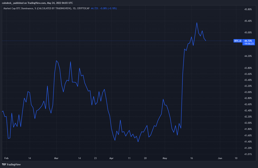 ค่า Bitcoin Dominance หรืออัตราการครองตลาดมากกว่าเหรียญ Altcoin อยู่ที่ 45% ของมูลค่าหลักทรัพย์ตามราคาตลาดทั้งหมด ซึ่งสูงในปี 2022