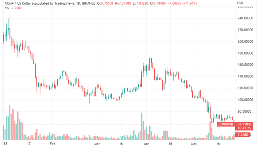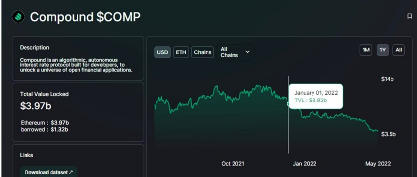 ค่า TVL ของ Compound ลดลงต่ำที่สุดในช่วงสัปดาห์สุดท้ายของเดือนพฤษภาคม 2022 เนื่องจากทัศนคติเชิงลบของมวลชนที่มีต่อแอ็ปพลิเคชันที่ปราศจากตัวกลางมาควบคุม (dApps)