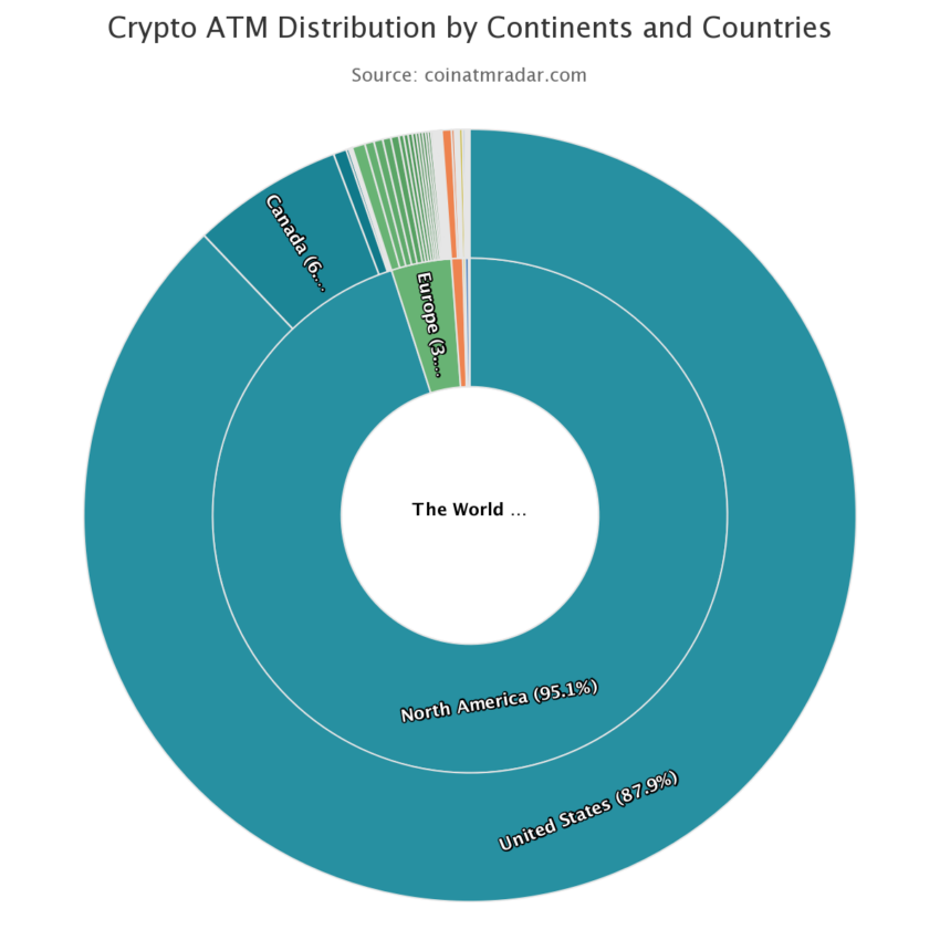 ในแง่ของประเทศต่าง ๆ สหรัฐอเมริกาอยู่ในอันดับต้น ๆ ของชาร์ตด้วยจำนวนตู้เอทีเอ็มมากที่สุดที่ 32,973 รองลงมาคือ แคนาดา (2,443 แห่ง) สเปน (229 แห่ง) และเอลซัลวาดอร์ (204 แห่ง)