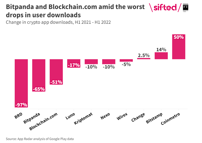 ในขณะเดียวกัน Blockchain.com ของสหราชอาณาจักรพบว่าการดาวน์โหลดแอปลดลง 51% เมื่อเทียบเป็นรายปี บริษัทเพิ่งปลดพนักงานออกในจำนวนเท่ากับ 25% ของพนักงาน และได้รับผลกระทบจาก crypto hedge fund ที่ล่มสลายอย่าง Three Arrows Capital ในเดือนกรกฎาคม