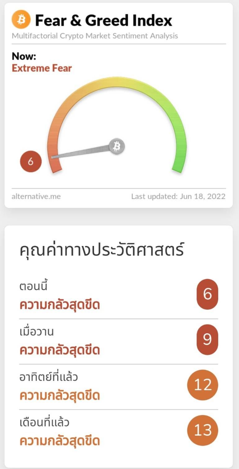 ดัชนีความกลัวและความโลภตามข้อมูลบน Alternative.me ขณะนี้ลงไปอยู่ระดับ 6 บ่งชี้ถึงระดับความเชื่อมั่นของนักลงทุนที่มีต่อตลาด Crypto ซึ่งสัมพันธ์กับสภาวะขาลงของตลาดสินทรัพย์อื่น ๆ ในปัจจุบัน