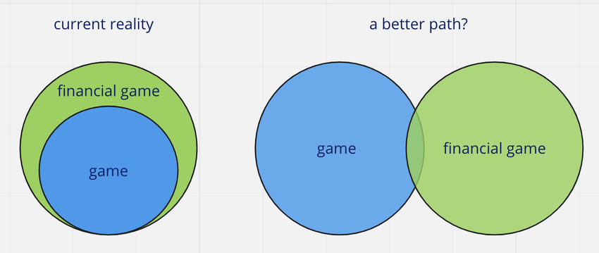 ประการแรก การแนะนำโทเค็น ณ จุดใด ๆ จะเป็นการแนะนำเกมการเงินที่หลีกเลี่ยงไม่ได้ ตามเนื้อผ้า เกมจำลองเกมชีวิตแบบเดียวกับที่เราเล่น แต่มีรั้วกั้นและอยู่ในเขตเศรษฐกิจปิด การแนะนำโทเค็นหรือ NFT จะนำรั้วหลักออกและเปิดขึ้นเพื่อสืบทอดขอบเขตทางการเงินเต็มรูปแบบของโลกแห่งความเป็นจริง แน่นอนว่ามีผู้เล่นที่ชื่นชอบเมตาเกมทางการเงิน อย่างไรก็ตาม นักเล่นเกมควรจะสามารถเล่นเกมไหนก็ได้โดยไม่ถูกหลอกให้เล่นเกมของคนอื่น