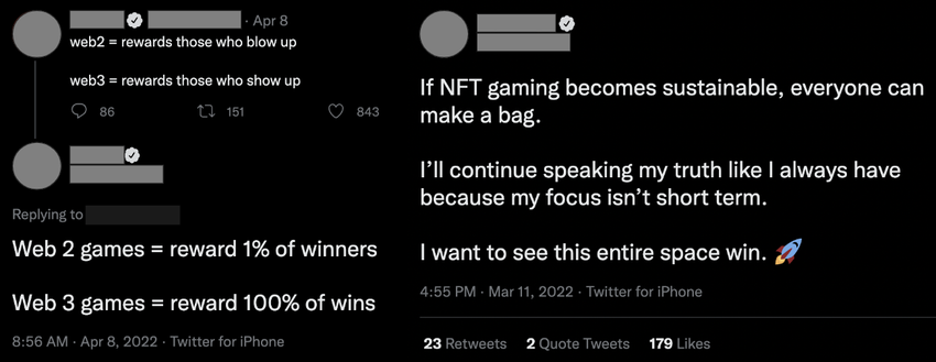 ความจริงที่ยากคือเกมใดๆ ที่แจกโทเค็นที่ซื้อขายหรือ NFT จะจ่ายผู้เล่นด้วยเงินที่มาจากใครบางคน ผู้สร้างเกมที่ถูกล่อลวงโดยคำเช่น “เกมที่ผู้เล่นเป็นเจ้าของ” ได้จ่ายเงินมากเกินไปให้กับผู้ใช้ช่วงแรกๆ โดยมีมูลค่าตลอดช่วงชีวิตของลูกค้าเป็นลบโดยหวังว่าจะสร้างชุมชนที่ภักดี ผู้เล่นยุคแรกเหล่านี้ส่วนใหญ่เป็นนักเก็งกำไรและ Farmer ที่ให้กระแสเงินสดที่แสดงถึงความสำเร็จใน Pool ที่เราเคยเห็นในเกมต่างๆ