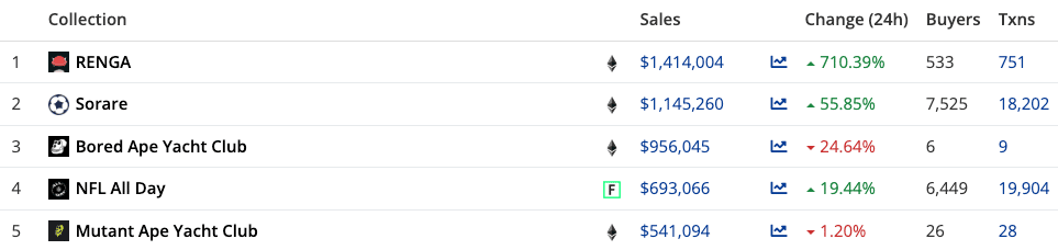ในขณะที่ RENGA และ Sorare ยังคงรักษาตำแหน่งที่แข็งแกร่งเหนือ BAYC เนื่องจากพวกเขาทำยอดขายได้มากกว่า 1 ล้านเหรียญสหรัฐในช่วงเวลาเดียวกัน