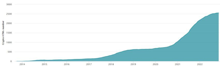 ในไตรมาสที่ 2 ปี 2022 มีตู้เอทีเอ็ม 2,479 เครื่อง ในขณะที่ในไตรมาสที่ 3 มีตู้เอทีเอ็ม 2,545 เครื่อง ประเทศได้เห็นตู้เอทีเอ็ม Bitcoin ใหม่ประมาณ 100 เครื่องทุกไตรมาสซึ่งสูงกว่าภูมิภาคอื่น ๆ ส่วนใหญ่อย่างมาก