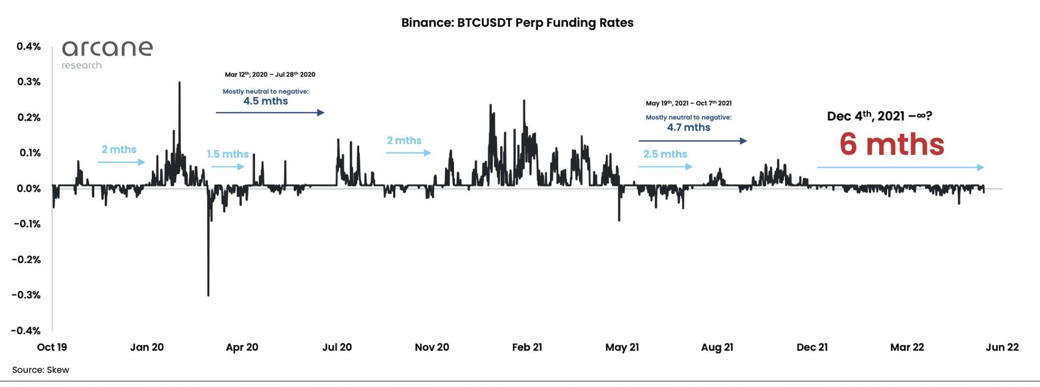 อัตราการระดมทุนของ Bitcoin หรือการเปิดพอร์ตในตำแหน่ง long และ short ในตลาดซื้อขาย Future อยู่ที่ประมาณระดับเป็นกลางในช่วง 6 เดือนที่ผ่านมา โดยใช้เวลาสี่เดือนตั้งแต่เดือนพฤษภาคมถึงตุลาคมปีที่แล้วในการระดมทุนแบบบีบอัด