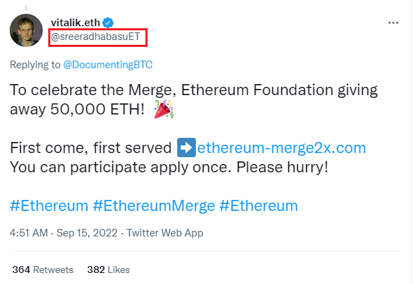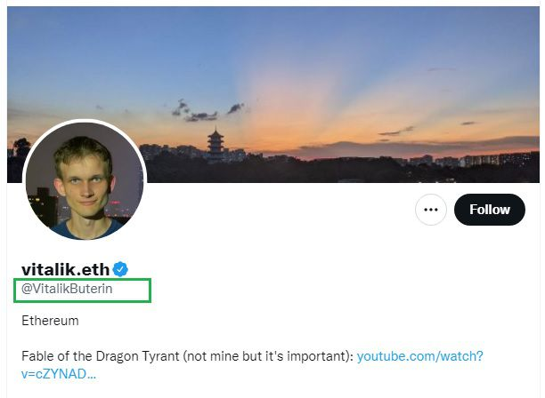 พวกเขาตั้งรูปโปรไฟล์เป็น Buterin แต่เมื่อดูที่ Twitter แล้วจะเห็นว่าชื่อผู้ใช้นั้นแตกต่างกัน กล่าวคือ Buterin มีบัญชีเดียวบน Twitter ซึ่งก็คือ @VitalikButerin และผู้ใช้ควรหลีกเลี่ยงบัญชีอื่น ๆ นอกจากนี้ ผู้ร่วมก่อตั้ง Ethereum เองได้กล่าวหลายครั้งว่าไม่มีการแจกโทเค็นฟรีใด  ๆ และขอให้ผู้ใช้ไม่ตกเป็นเหยื่อของการหลอกลวง