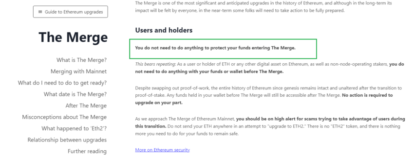 The Merge ไม่ได้กําหนดให้ผู้ถือ ETH กระทำการใด ๆ ประชาสัมพันธ์ต่าง ๆ ของ Ethereum เกี่ยวกับ The Merge ระบุอย่างชัดเจนว่าผู้ใช้งานไม่จําเป็นต้องทําอะไรกับทรัพย์สินของพวกเขาในขณะที่การอัปเกรดเกิดขึ้น