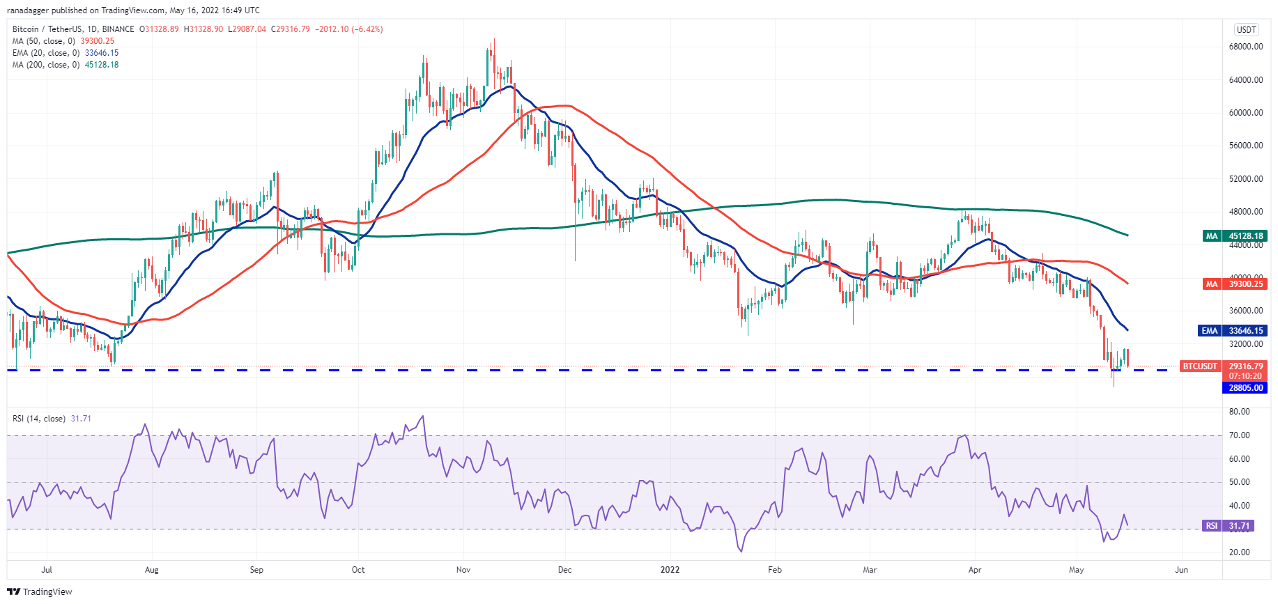 หากราคา BTC/USDT ดีดตัวขึ้นจาก 28,805 ดอลลาร์ กระทิงจะพยายามกดไปที่ค่าเฉลี่ยเคลื่อนที่แบบเอ็กซ์โพเนนเชียล 20 วัน (EMA) ที่ 33,646 ดอลลาร์ อีกครั้ง ซึ่งเป็นระดับสำคัญที่ต้องจับตามอง เนื่องจากการพักและปิดเหนือระดับดังกล่าวอาจบ่งชี้ว่ากระทิงกำลังพยายามกลับมา โดยทั้งคู่สามารถขึ้นสู่ค่าเฉลี่ยเคลื่อนที่อย่างง่าย (SMA) 50 วัน ที่ 39,300 ดอลลาร์