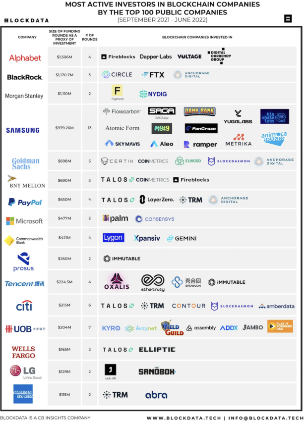บริษัทยักษ์ใหญ่ ด้านเทคโนโลยี ได้ทำการลงทุน 1.5 พันล้านดอลลาร์ไปตั้งแต่เดือนกันยายน 2021 ถึงเดือนมิถุนายน 2022 ในบริษัทบล็อกเชน 4 แห่ง ได้แก่ บริษัทดูแลระบบดิจิทัล Fireblocks, บริษัทร่วมทุน Digital Currency Group, แพลตฟอร์มโครงสร้างพื้นฐานของ Lightning Node Voltage, และบริษัทวิดีโอเกมบล็อกเชน Dapper Labs