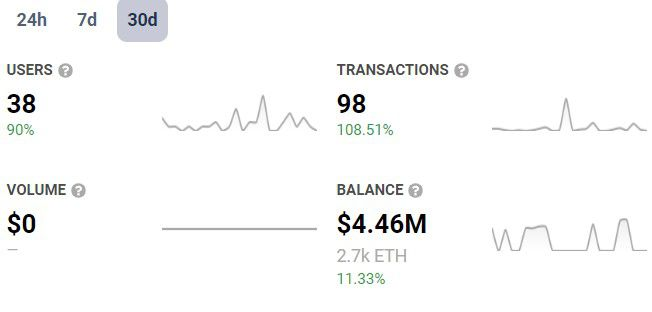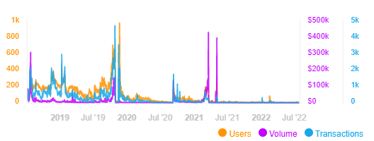 แม้ว่ากิจกรรมบนเครือข่ายนั้นดูจะเป็นไปในทางบวกในช่วง 30 วันที่ผ่านมา แต่ในปีที่ผ่านมานี้ พบว่าผู้ใช้งาน ปริมาณการซื้อขาย และการทำธุรกรรมโดยรวมลดลงตามข้อมูลของ DappRadar