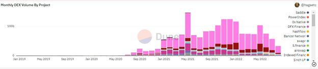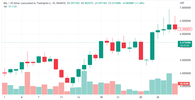 ถึงแม้ว่า ปริมาณการซื้อขายจะลดลงเป็นอย่างมาก แต่มันก็มีปริมาณการซื้อขายเพิ่มขึ้นถึง 54% จากเดือนกรกฎาคมของปีที่แล้ว ในเดือนกรกฎาคม 2021 ปริมาณการซื้อขายของ Balancer อยู่ที่ 1.23 พันล้านดอลลาร์