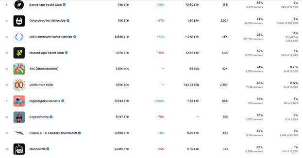 คอลเล็กชั่นยอดนิยมอันดับต้นๆ บน OpenSea นั้นรวมถึง Bored Ape Yacht Club (BAYC), Otherdeed จาก Otherside, Mutant Ape Yacht Club (MAYC), CryptoPunks และ Moonbirds จากตารางด้านล่าง NFT ที่ไม่ได้อยู่ใน 10 อันดับแรกของของสะสมดิจิทัลในเรื่องยอดขายตลอดกาลคือ Ethereum Name Service, ABC, y00ts, DigiDaigaku Genesis และ CLONE X – X TAKASHI MURAKAMI