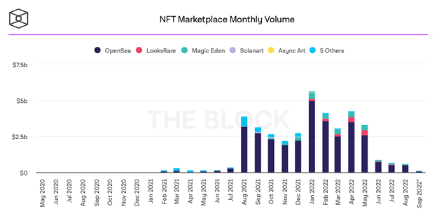 ถึงแม้ว่าปริมาณการซื้อขายในเดือนสิงหาคมจะลดลงมากกว่า 80% จากจุดสูงสุดของปีนี้ แต่ OpenSea ยังคงเป็นผู้นำในตลาด NFT ที่มีปริมาณการซื้อขายรายเดือนที่มากที่สุด