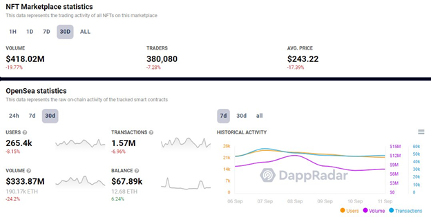 ปริมาณการซื้อขายของ OpenSea ลดลงอีกในเดือนสิงหาคม อันมีสาเหตุมาจากการที่ตลาด Crypto โดยรวมเป็นขาลง ซึ่งส่งผลกระทบต่อยอดขายในตลาด NFT ทั่วโลกในเชิงลบ