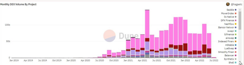 Sponsoredแม้ว่าตัวเลขของสถิตินี้อาจจะดูสูงเนื่องจากการที่ความสนใจของนักลงทุนลดลง รวมไปถึงสภาพคล่องที่ค่อนข้างต่ำใน DEX อื่นๆ เช่น Balancer, Curve, SushiSwap และ 1inch ปริมาณการซื้อขายของ Uniswap ลดลงตั้งแต่เดือนพฤษภาคม