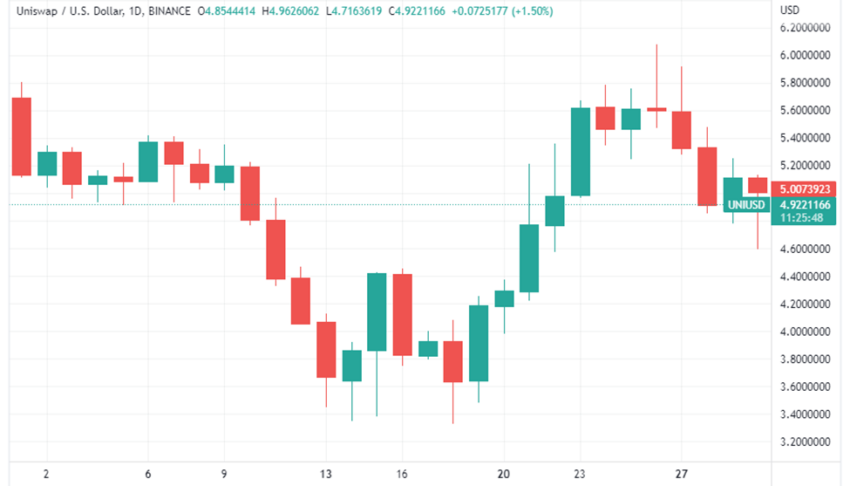 UNI เปิดที่ราคา 5.70 ดอลลาร์ในวันที่ 1 มิถุนายน แตะระดับสูงสุดรายเดือนที่ราคา 6 ดอลลาร์ในวันที่ 26 มิถุนายน ทดสอบระดับต่ำสุดรายเดือนที่ราคา 3.37 ดอลลาร์ในวันที่ 18 มิถุนายน และปิดเดือนที่ 6 ของปีด้วยราคาซื้อขายที่ 4.98 ดอลลาร์