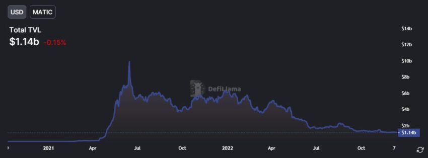 DeFi บน Polygon ได้รับความนิยมเล็กน้อยในปีนี้ มูลค่ารวมที่ถูกล็อกบนเครือข่ายในปัจจุบันอยู่ที่ประมาณ 1.14 พันล้านดอลลาร์ ตามข้อมูลของ DeFiLlama ซึ่งแสดงถึงการลดลง 81% ตั้งแต่ต้นปี แต่สะท้อนถึงสถานการณ์ที่คล้ายกันสำหรับระบบนิเวศ DeFi ทั้งหมด
