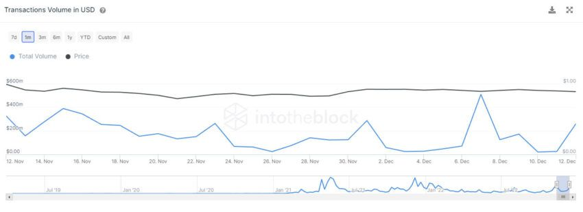 ปริมาณที่เพิ่มขึ้นได้บดบังค่าเฉลี่ยเจ็ดวันที่ 170 ล้านดอลลาร์สหรัฐต่อวัน อย่างไรก็ตาม ปริมาณธุรกรรมพุ่งขึ้นสูงสุดรายเดือนในวันที่ 7 ธันวาคม 2022 โดยมีมูลค่าสูงถึง 511 ล้านดอลลาร์สหรัฐ ตามข้อมูลของ IntoTheBlock