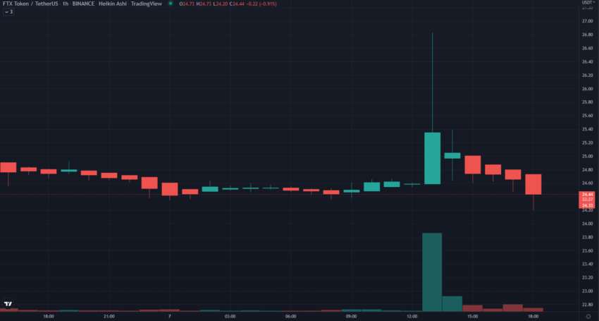 หลังจากแถลงการณ์ FTT โทเค็นดั้งเดิมของ FTX พุ่งขึ้นเป็น 26.82 ดอลลาร์สหรัฐบน Binance ก่อนที่จะลดลงเหลือ 24.40 ดอลลาร์สหรัฐในขณะที่เขียน
