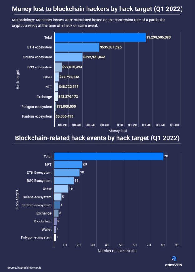 Atlas VPN เผยสถิติที่รวบรวมจากการถูกแฮกระบบ ระบุว่า ไตรมาสที่ 1 มีเหตุการณ์เข้าขโมยคริปโตเกิดขึ้นทั้งหมด 78 ครั้ง มูลค่าความเสียหาย 1.3 พันล้านดอลลาร์ โดย 1 พันล้านเกิดจากการโจมตี Ethereum และ Solana รวมกัน
