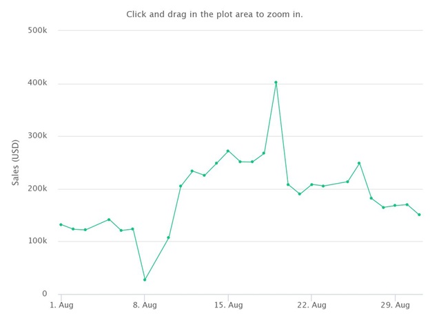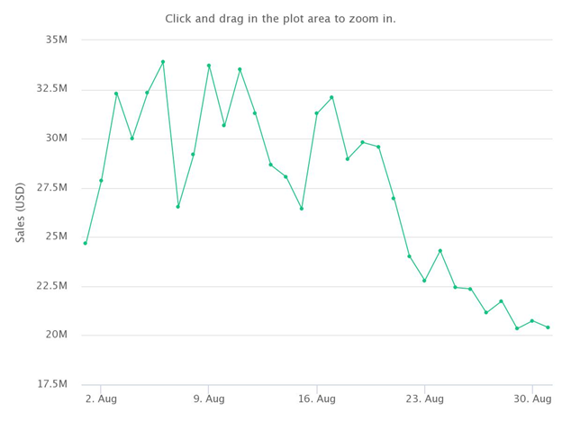 ยอดขายในเดือนสิงหาคมนั้นลดลงถึง 99% เมื่อเทียบแบบปีต่อปี ในช่วงเวลาดังกล่าวนั้น มีผู้ซื้อที่ไม่ซ้ำกัน 305,264 ราย ซึ่งสอดคล้องกับธุรกรรม 1.85 ล้านรายการ
