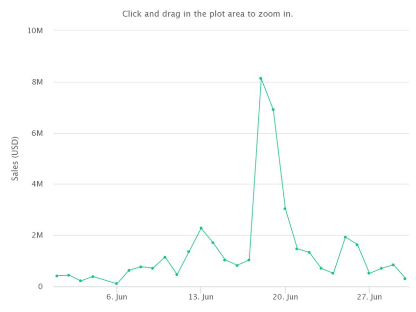 ยอดขายของ CryptoPunks ก็เป็นเหมือนเช่นเดียวกับ Non-Fungible Tokens (NFT) อื่นๆ เกือบทั้งหมด คือมียอดขายรายเดือนในเดือนมิถุนายนต่ำกว่าระดับสูงสุดที่เคยทำได้ในช่วงต้นปี
