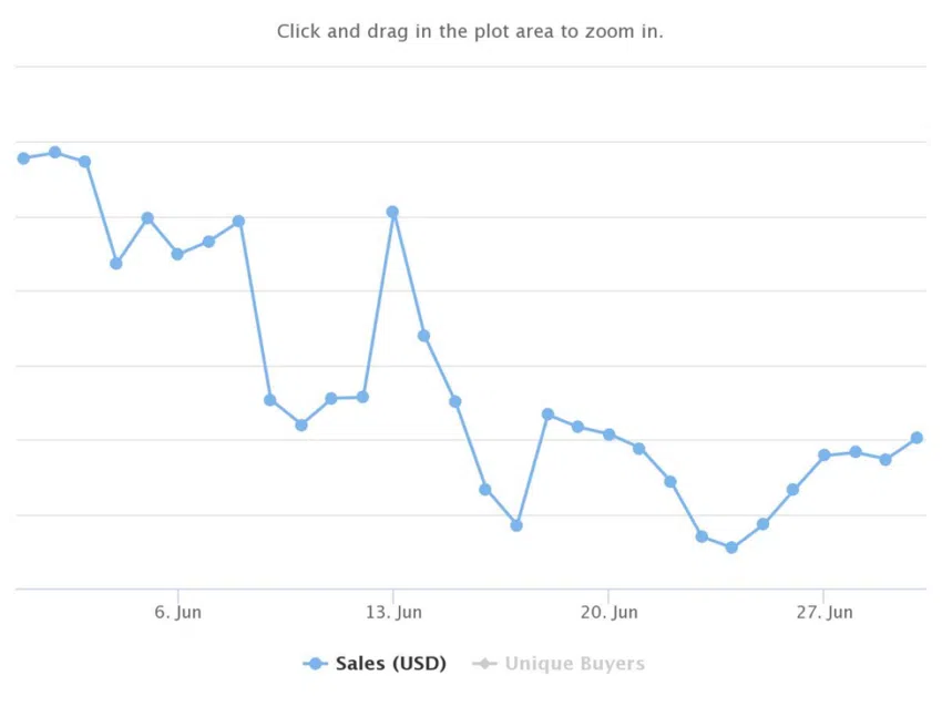 เมื่อดูถึงจำนวนผู้ซื้อที่ไม่ซ้ำกัน (Unique Buyer) ที่ลดลงของ NFT ชั้นนำที่อยู่ในระบบนิเวศของเครือข่ายในเดือนมิถุนายน การลดลงของปริมาณการขายซื้อตามลำดับทำให้จำนวนธุรกรรมของสะสมดิจิทัลในบล็อกเชนลดลง โดยมีจำนวนผู้ซื้อที่ไม่ซ้ำกัน 230,225 ราย และธุรกรรม 1,045,525 รายการ