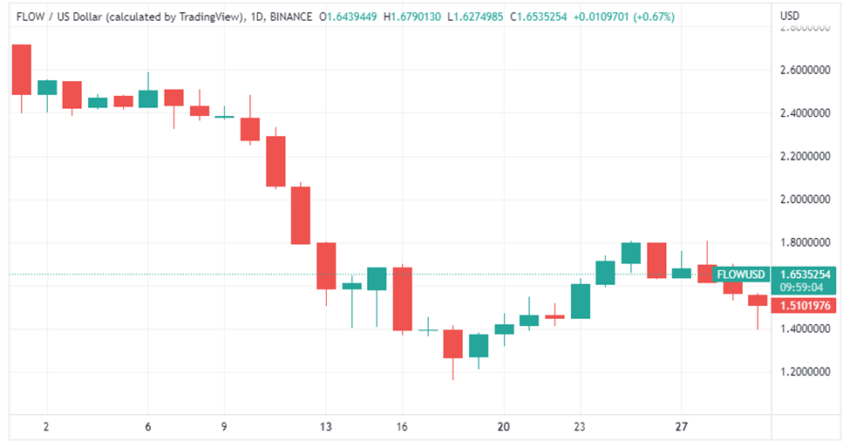 FLOW เปิดราคาเมื่อวันที่ 1 มิถุนายน ด้วยราคาซื้อขายที่ 2.71 ดอลลาร์ แตะระดับสูงสุดประจำเดือนที่ราคา 2.72 ดอลลาร์ ทดสอบระดับต่ำสุดประจำเดือนที่ราคา 1.17 ดอลลาร์ และปิดเดือนที่ราคา 1.50 ดอลลาร์ โดยรวมแล้ว นี่เท่ากับเป็นการลดลง 44% ของราคาเปิดและปิดของ FLOW ในเดือนมิถุนายน