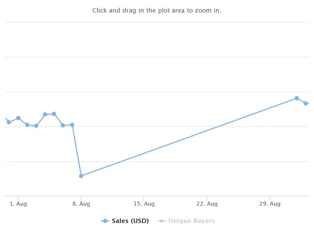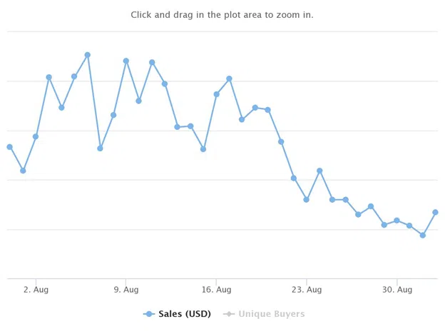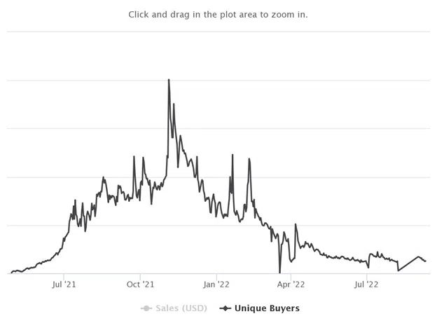 ซึ่งหมายความว่าผู้ซื้อที่ไม่ซ้ำกันและจำนวนธุรกรรมทั้งหมดในเดือนสิงหาคม 2022 ต่ำกว่าตัวเลขจากช่วงเดียวกันของปีที่แล้วอยู่ที่ 94% และ 95% ตามลำดับ ราคาขายโดยเฉลี่ยลดลง 97% เมื่อเทียบแบบปีต่อปีจาก 457.66 ดอลลาร์ในเดือนสิงหาคม 2021 เหลือ 11.94 ดอลลาร์ในเดือนสิงหาคม 2022