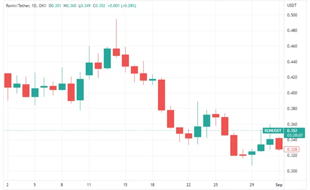 สินทรัพย์ดั้งเดิมของระบบนิเวศ Ronin มีราคาซื้อขายระหว่าง 0.31 ถึง 0.46 ดอลลาร์ในเดือนสิงหาคมหลังจากที่มีราคาเปิดและปิดที่ 0.43 ดอลลาร์และ 0.34 ดอลลาร์ ตามลำดับ