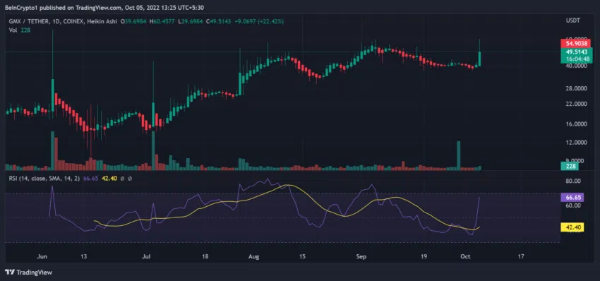 เมื่อดูที่กราฟราคาของ GMX นั้นแสดงให้เห็นถึงความพึงพอใจของนักลงทุนรายย่อยที่เพิ่มสูงขึ้นจากการที่ Altcoin พุ่งขึ้นเกือบ 50% ในเวลาเพียงวันเดียว RSI เริ่มเข้าสู่ Overbought Zone (โซนที่มีกำลังซื้อในปริมาณมากจนเกินไป) และแสดงถึงผู้ซื้อที่มีการกระจุกตัวสูง