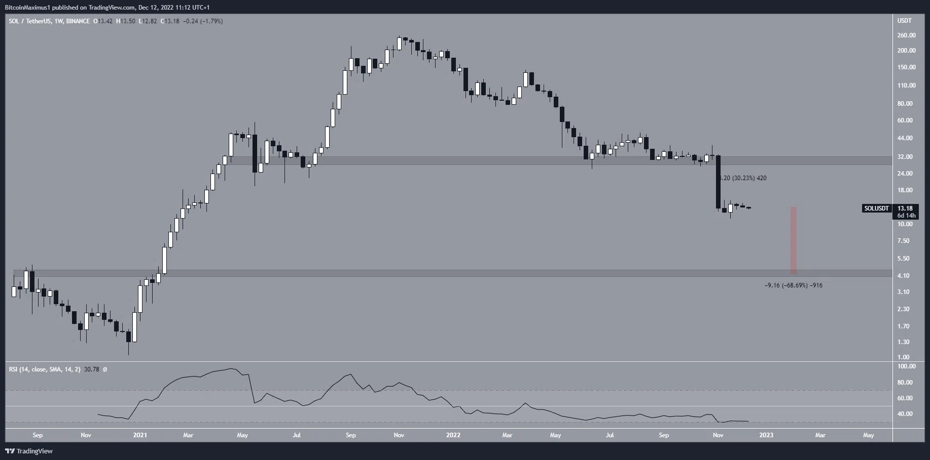 ราคาของ Solana ลดลงตั้งแต่มันทำสถิติสูงสุดตลอดกาลที่ 259.90 ดอลลาร์ในเดือนพฤศจิกายน 2021 การร่วงลงมาของราคาหลังจากนั้นทำให้มันหลุดจากแนวรับระยะยาวที่ 29 ดอลลาร์ หลังจากนั้น ราคา Solana ก็ลงมาแตะระดับต่ำสุดที่ 10.94 ดอลลาร์ในเดือนพฤศจิกายน 2022