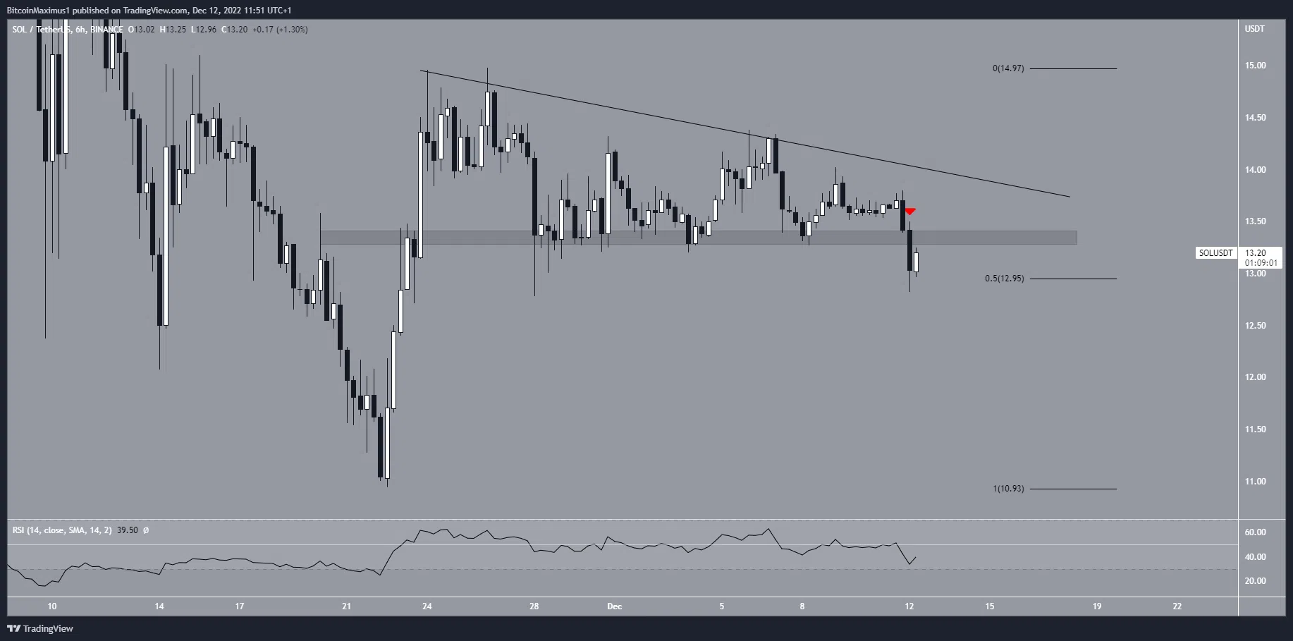 หลังจากที่มัน Breakdown (การที่กราฟมีราคาทะลุแนวรับที่ตั้งเอาไว้) ลงมา ราคา SOL เด้งขึ้นเล็กน้อยที่ระดับแนวรับ 0.5 Fib Retracement ที่ 12.95 ดอลลาร์ อย่างไรก็ตาม มันก็ไม่ได้มีสัญญาณที่สนับสนุนในความเคลื่อนไหวขาขึ้นแต่อย่างใด ระดับแนวรับ 0.5 Fib Retracement เป็นระดับแนวรับสุดท้ายก่อนจะลงจุดต่ำสุดใหม่รอบปี ซึ่งการ Breakdown จะส่งผลให้อัตราการลดลงของราคาถูกเร่งให้เร็วขึ้นได้