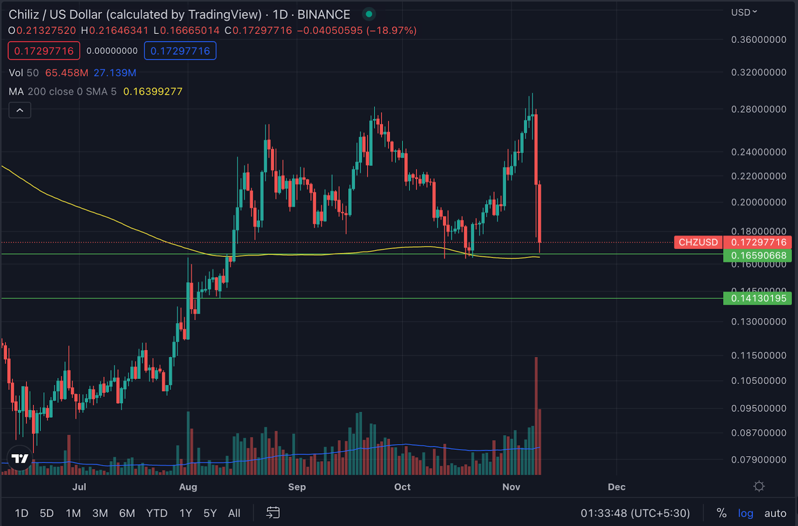 หากราคาปิดต่ำกว่าแนวรับนี้ มันจะกลายเป็นการ Breakdown (การที่กราฟมีราคาทะลุแนวรับที่ตั้งเอาไว้) แบบ Double-Top การ Breakdown ลงมาอาจจะส่งให้ราคาตกลงไปที่ระดับ 0.1100 นอกจากนี้ SMA 200 วันจะทำหน้าที่เป็นแนวต้านหากมีการปิดราคาที่ด้านล่าง อย่างไรก็ตาม CHZ อาจจะมีการเด้งกลับเล็กน้อยจากราคา 0.1413 ดอลลาร์ หากมันมีการ Breakdown ลงมา