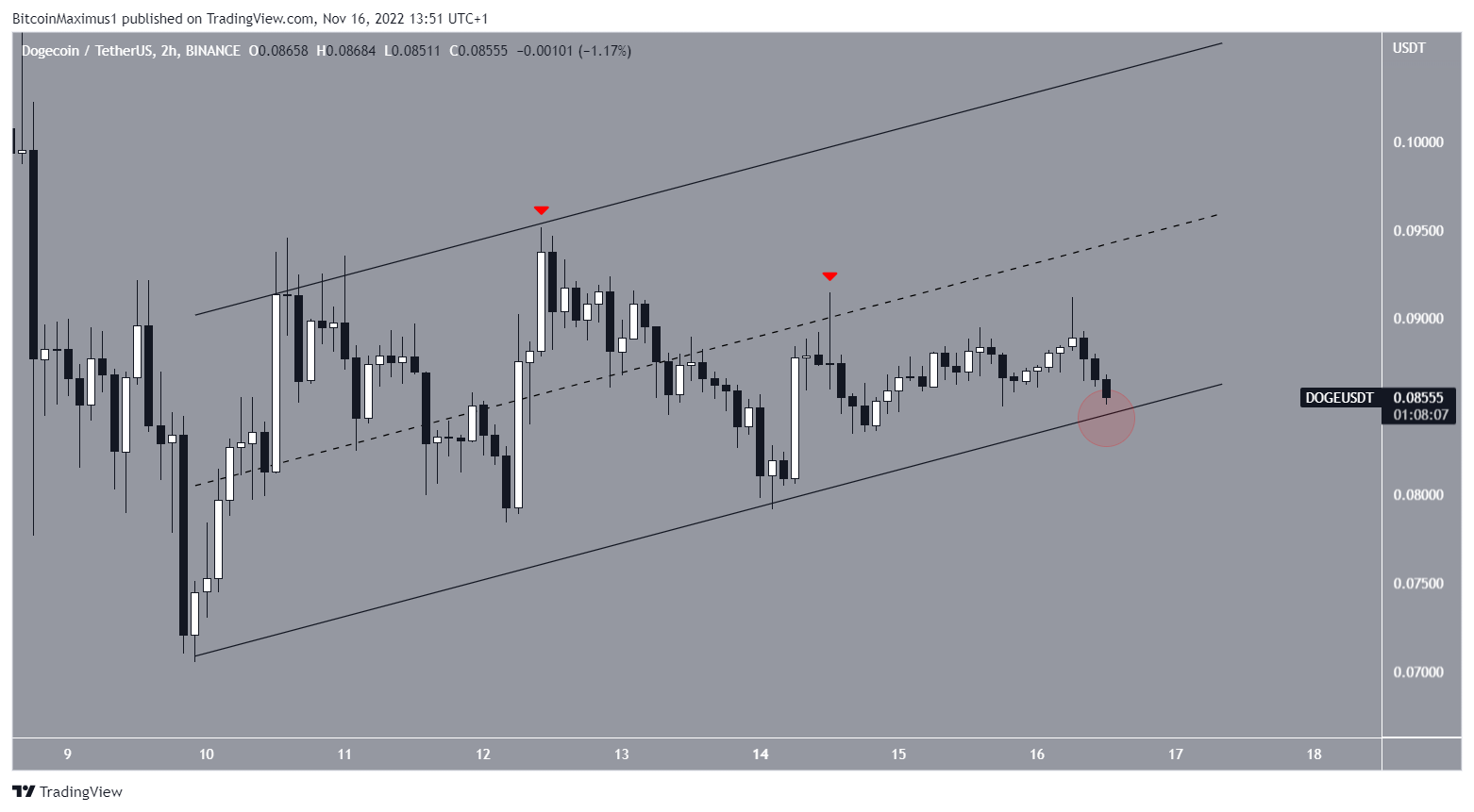 กราฟระยะสั้น 2 ชั่วโมงสนับสนุนความเป็นไปได้ของการ Breakdown ราคาของ Dogecoin นั้นซื้อขายอยู่ในช่องทางคู่ขนานจากน้อยไปมาก ซึ่งถือว่าเป็นรูปแบบขาลง (Bearish Pattern)