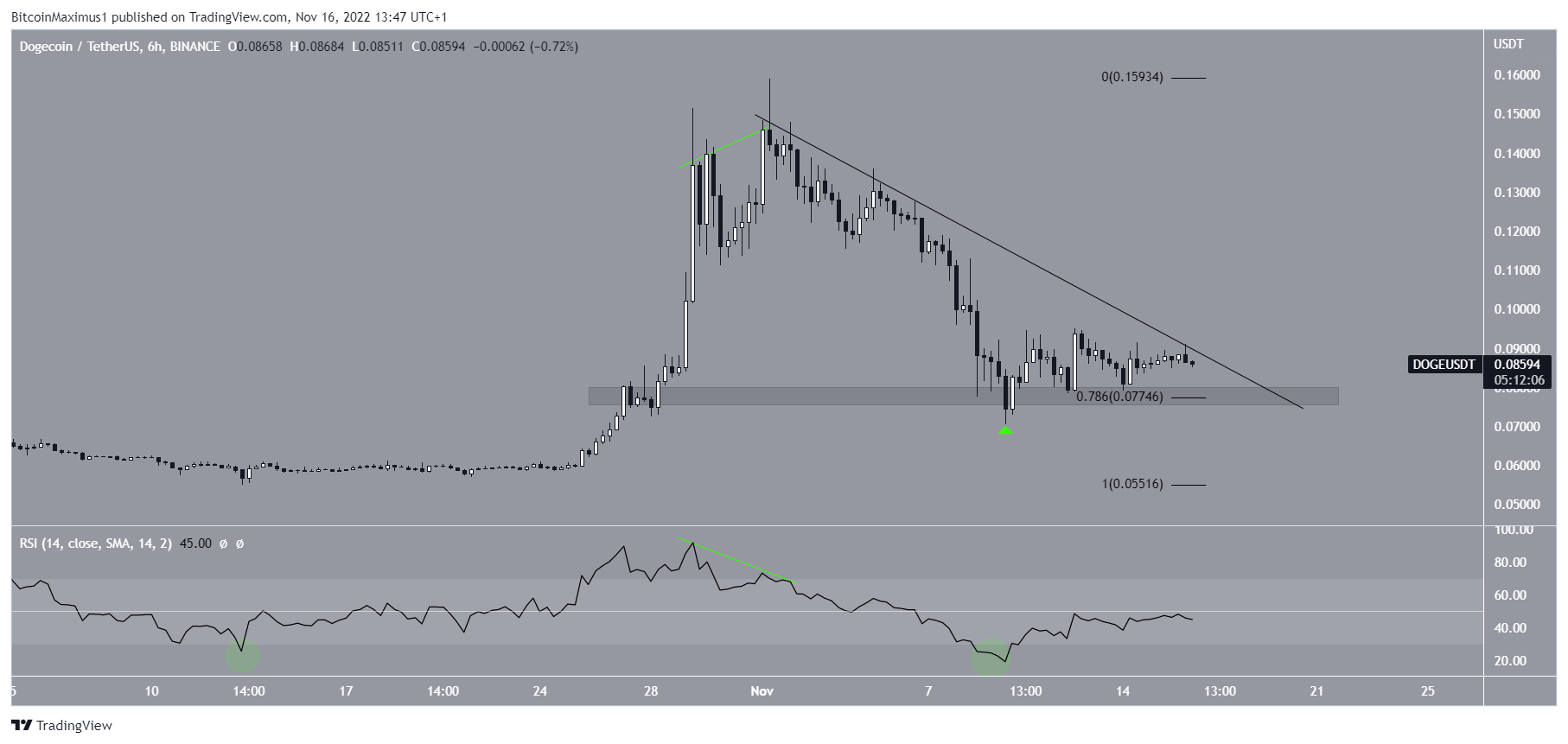 การลดลงดังกล่าวนำมันไปสู่ระดับต่ำสุดที่ 0.07 ดอลลาร์ในวันที่ 9 พฤศจิกายน หลังจากนั้น ราคา Dogecoin ได้เด้งกลับ (ไอคอนสีเขียว) โดยยืนยันพื้นที่ 0.07 ดอลลาร์เป็นแนวรับ นี่คือระดับแนวรับ 0.786 Fib Retracement และพื้นที่แนวรับแนวนอน