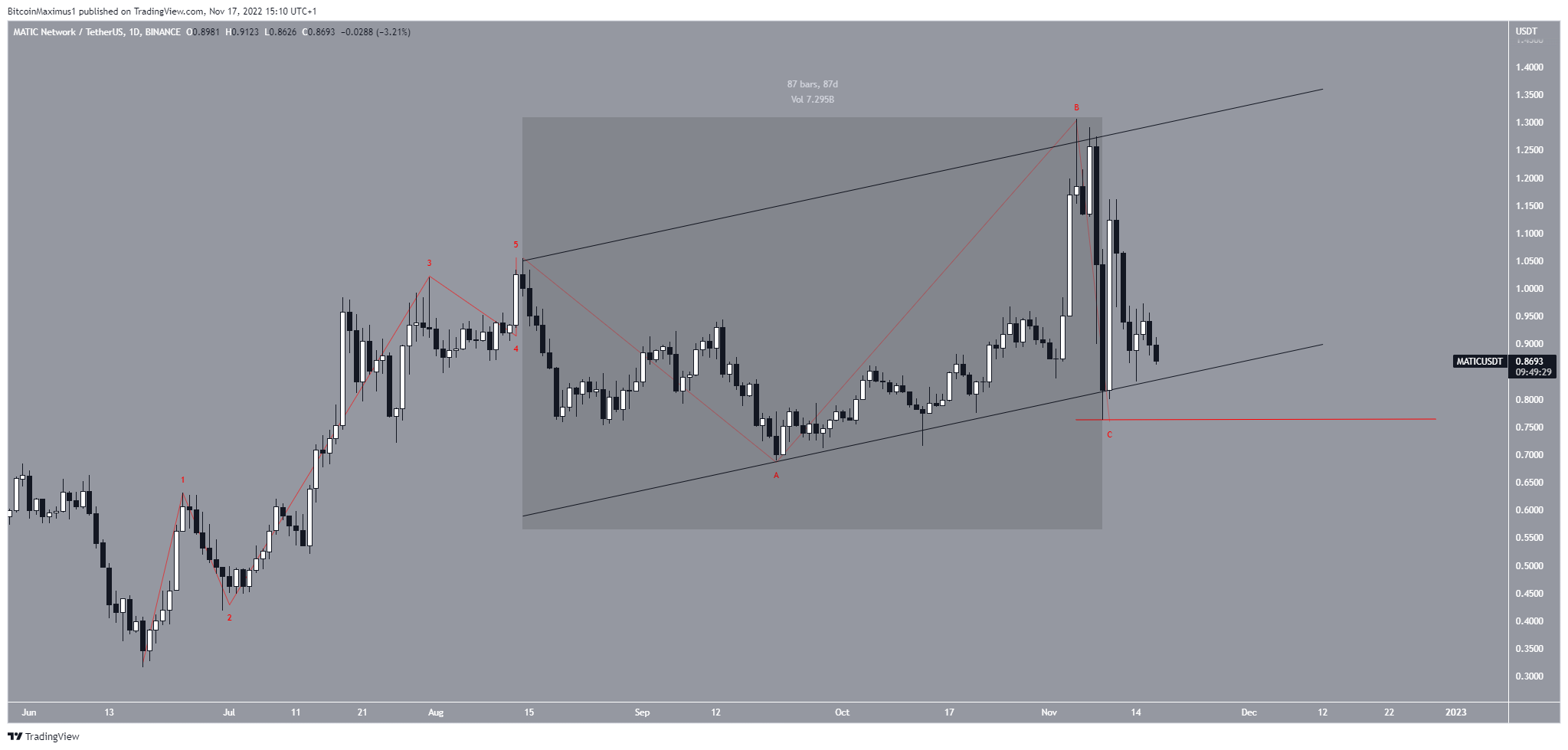 Bearish Count บ่งชี้ว่า MATIC ได้สร้าง A-B-C Corrective Structure เสร็จสิ้นแล้ว ในนั้น คลื่น A:C มีอัตราส่วนน้อยกว่า 1:1 เล็กน้อย หากเรื่องนี้ถูกต้องก็หมายความว่าราคาของมันจะลดลงสู่ระดับต่ำสุดใหม่ในรอบปี Count ดังกล่าวจะกลายเป็นโมฆะเมื่อมันวิ่งสูงขึ้นเหนือคลื่น C ที่ 1.30 ดอลลาร์ (เส้นสีแดง)