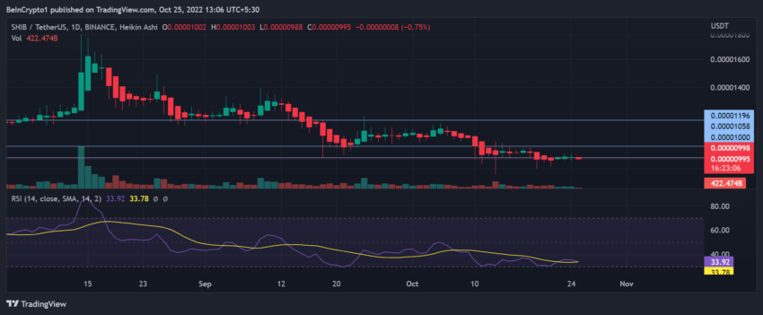ในขณะที่เขียนข่าว ราคาของ SHIB ลดลงต่ำกว่าระดับแนวรับหลักและซื้อขายกันอยู่ที่ราคา 0.000009986 ดอลลาร์