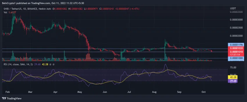 จากมุมมองของราคา SHIB มีการซื้อขายใกล้กับระดับแนวรับ 0.00001000 ดอลลาร์ ซึ่งทำหน้าที่เป็นแนวต้านที่สำคัญในช่วง Q2 และ Q3 2022 RSI รายวันมุ่งหน้าไปสู่ Oversold Zone (โซนที่มีการเทขายในปริมาณมากจนเกินไป) ซึ่งเป็นการบ่งบอกว่าผู้ขายมีอิทธิพลต่อตลาดเนื่องจากปริมาณการซื้อขายยังคงอยู่ในระดับต่ำ