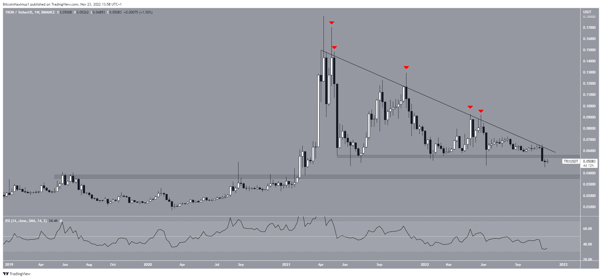 การวิเคราะห์ทางเทคนิคของกรอบเวลารายสัปดาห์สำหรับราคา TRX นั้นให้มุมมองที่เป็นขาลง ราคา Tron (TRX) ได้ลดลงต่ำกว่าเส้นแนวต้านจากมากไปน้อย (Descending Resistance Line) นับตั้งแต่ราคาไปแตะจุดสูงสุดในปี 2021 ในเดือนเมษายน