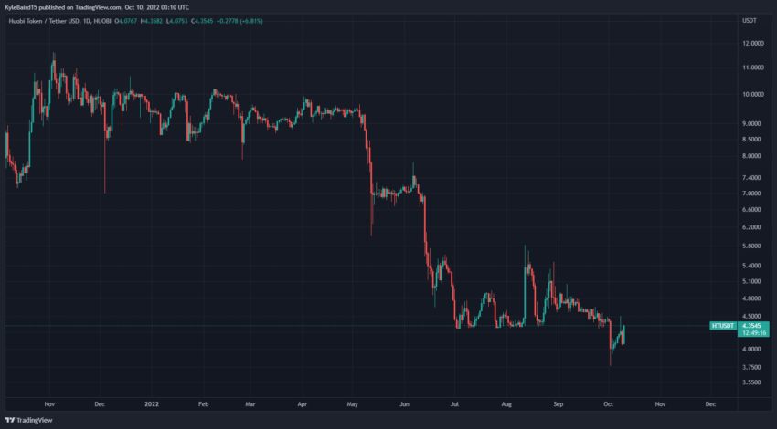 ราคาโทเค็นดั้งเดิมของ Huobi คือ HT พุ่งสูงขึ้นในช่วงสามชั่วโมงที่ผ่านมา โดยเพิ่มขึ้น 5% ทำให้มียอดซื้อขายที่ 4.30 ดอลลาร์สหรัฐในขณะที่เขียน ตามรายงานของ CoinGecko ราคาของ HT ยังทรงตัวในช่วงสามเดือนที่ผ่านมาและลดลง 89% จากระดับสูงสุดเป็นประวัติการณ์ในเดือนพฤษภาคม 2021